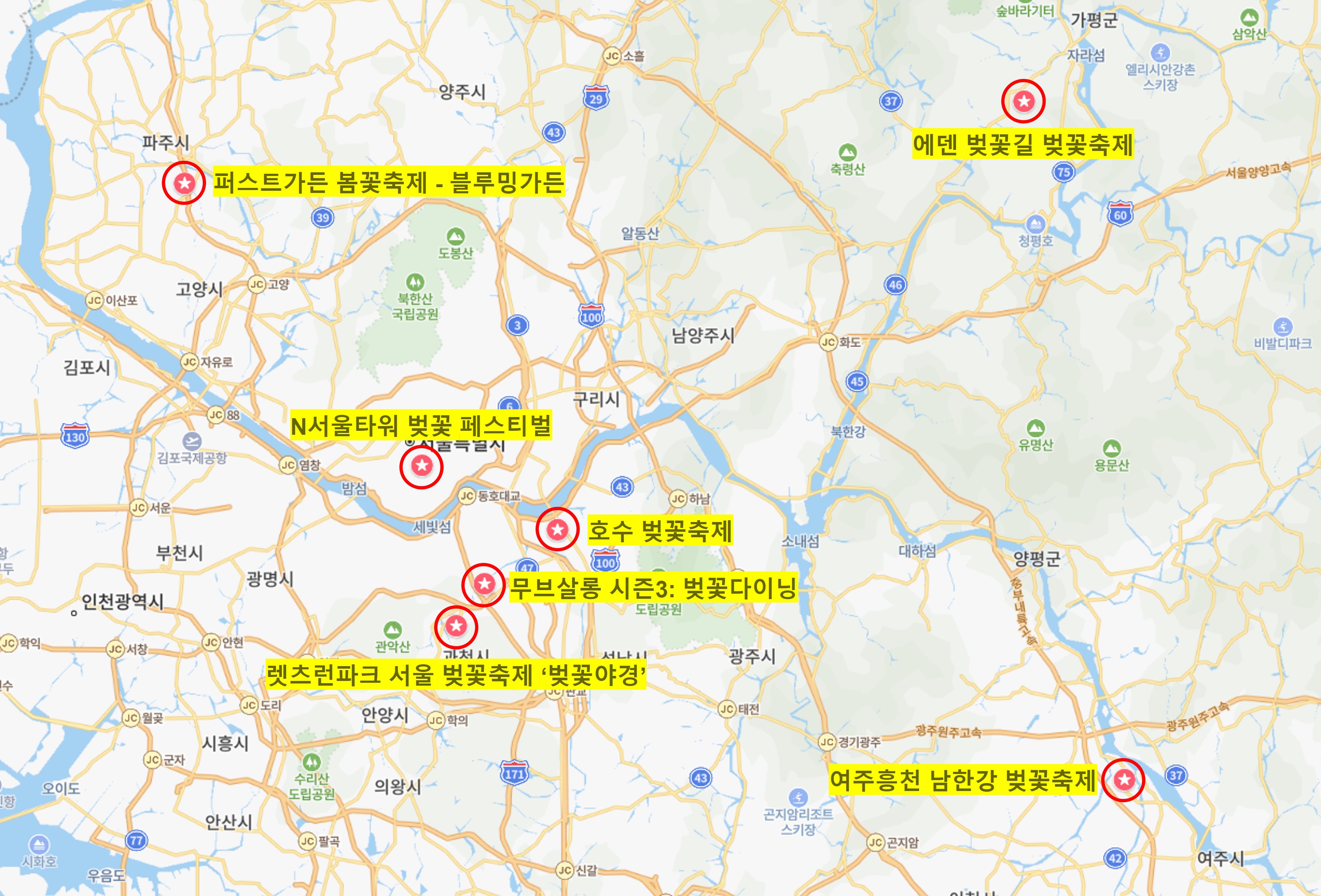 24년 서울·경기 지역 벚꽃축제 지도 24년 서울·경기 지역 벚꽃축제 요약 호수 벚꽃축제 ● 기간: 24년 3월 27일 수요일 ~ 3월 31일 일요일 ● 장소: 송파나루공원 석촌호수 (서울특별시 송파구 삼학사로 136) 무브살롱 시즌3: 벚꽃다이닝 ● 기간: 24년 3월 29일 금요일 ~ 3월 31일 일요일 ● 장소: 양재천 영동1교 하부 굴다리 (서울특별시 서초구 양재동 영동1교 하부 굴다리) 여주흥천 남한강 벚꽃축제 ● 기간: 24년 3월 29일 금요일 ~ 3월 31일 일요일 ● 장소: 여주시 흥천면 귀백리 사거리 일원 (경기도 여주시 흥천면 귀백리 168-3번지 일원) 렛츠런파크 서울 벚꽃축제 '벚꽃야경' ● 기간: 24년 3월 29일 금요일 ~ 4월 21일 일요일 ● 장소: 렛츠런파크 서울 (경기..